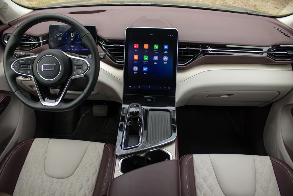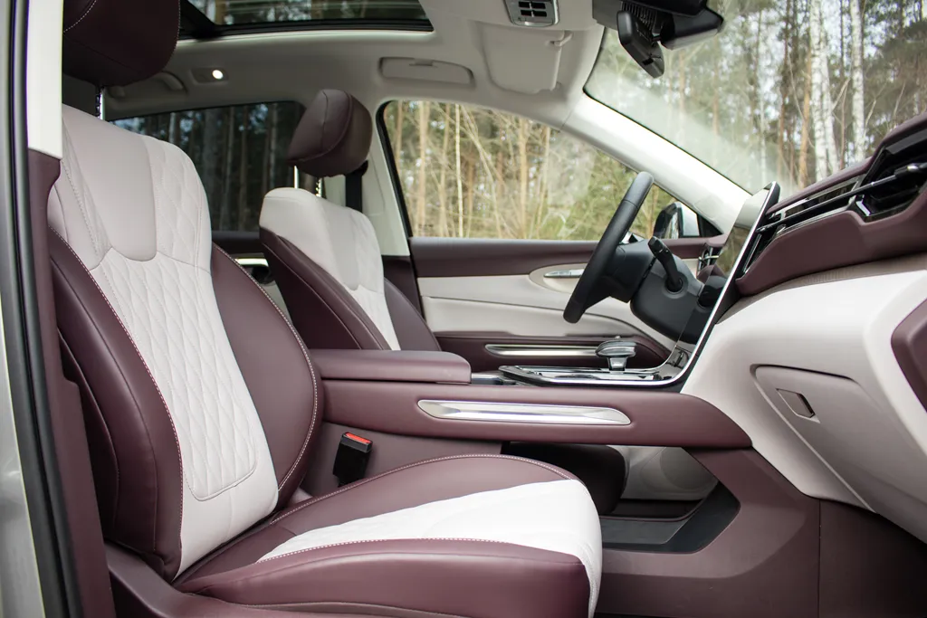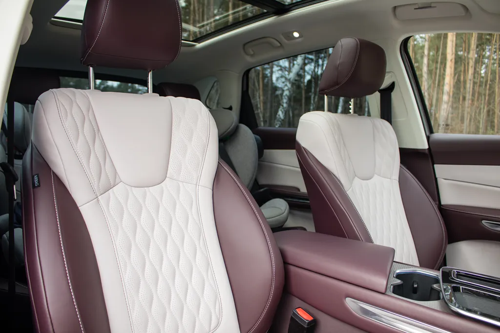 Wnętrze wykończono tapicerką skórzaną w odcieniu wiśniowo-kremowym — materiał ten znajdziemy nie tylko na fotelach, ale również na boczkach drzwi. W górnych partiach dominują miękkie tworzywa i elementy pokryte skórą ekologiczną, uzupełnione o oświetlenie ambientowe. Niżej pojawiają się twardsze plastiki oraz wstawki piano black, ale ogólne wrażenie jakości pozostaje bardzo dobre, a spasowanie elementów nie budzi zastrzeżeń.