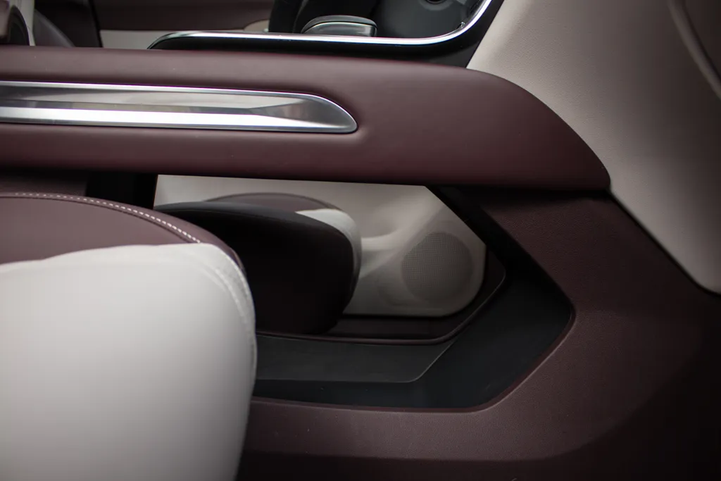 Całość uzupełniają detale — podświetlany dekor przed pasażerem oraz nietypowe zestawienie kolorystyczne. Jasna tapicerka połączona z bordowymi i wpadającymi w fiolet akcentami wygląda świeżo i skutecznie ożywia wnętrze.