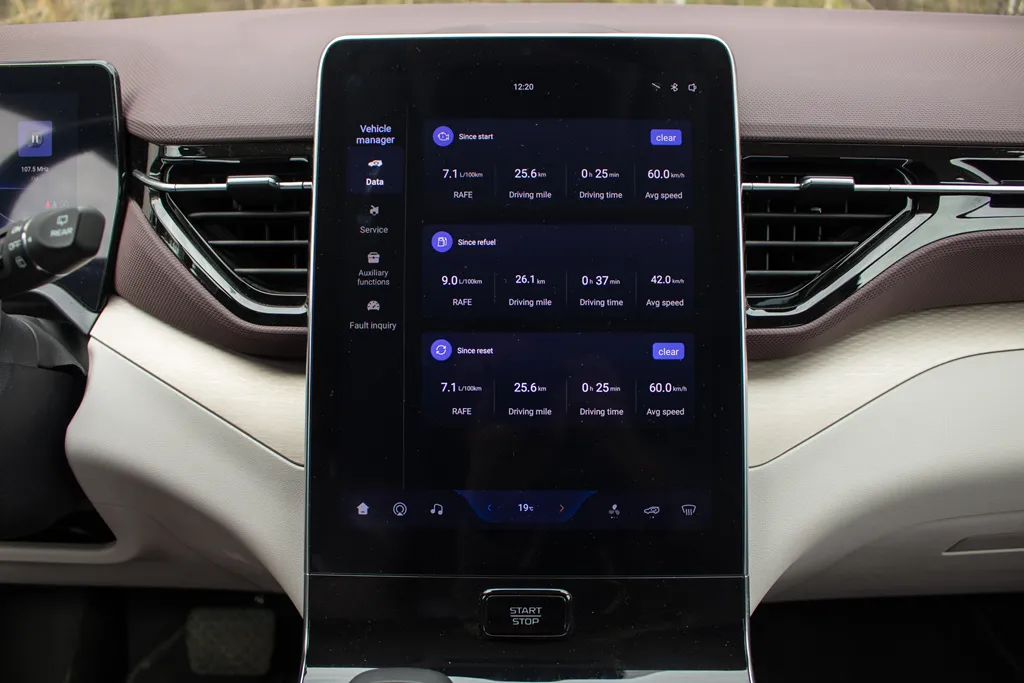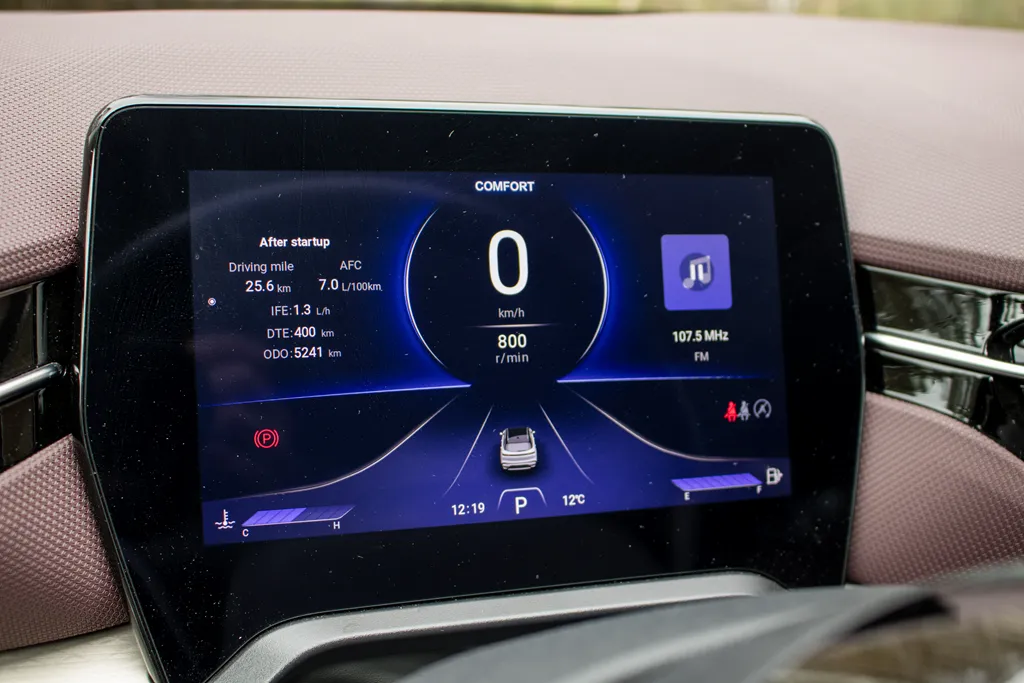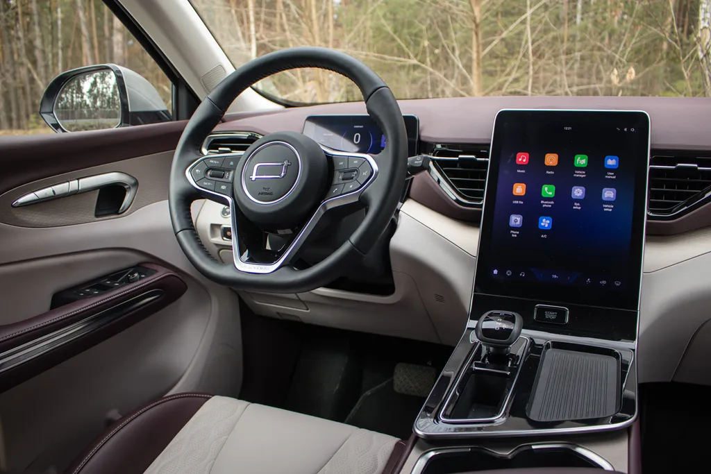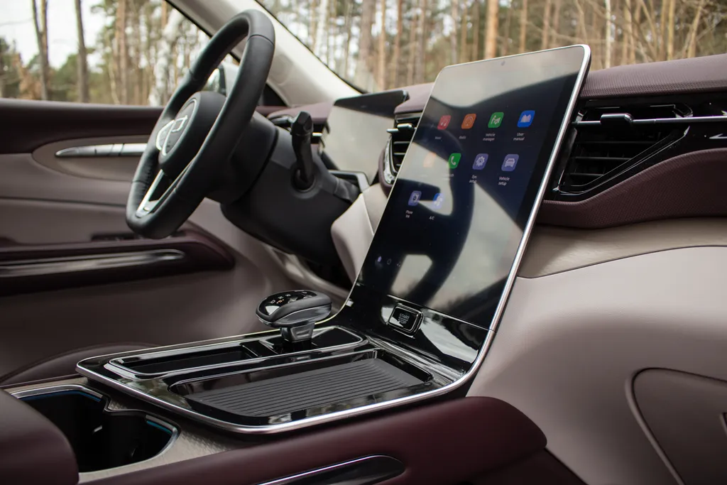 Nie obyło się jednak bez wad. Do obsługi Android Auto i Apple CarPlay potrzebny jest zewnętrzny dongiel, a system opiera się na chińskiej aplikacji CarbitLink. Sam system potrafi się też momentami przyciąć — szczególnie widoczne jest to przy podglądzie danych o zużyciu energii, gdzie zdarzają się chwilowe zawieszenia i konieczność ponownego wejścia w menu.