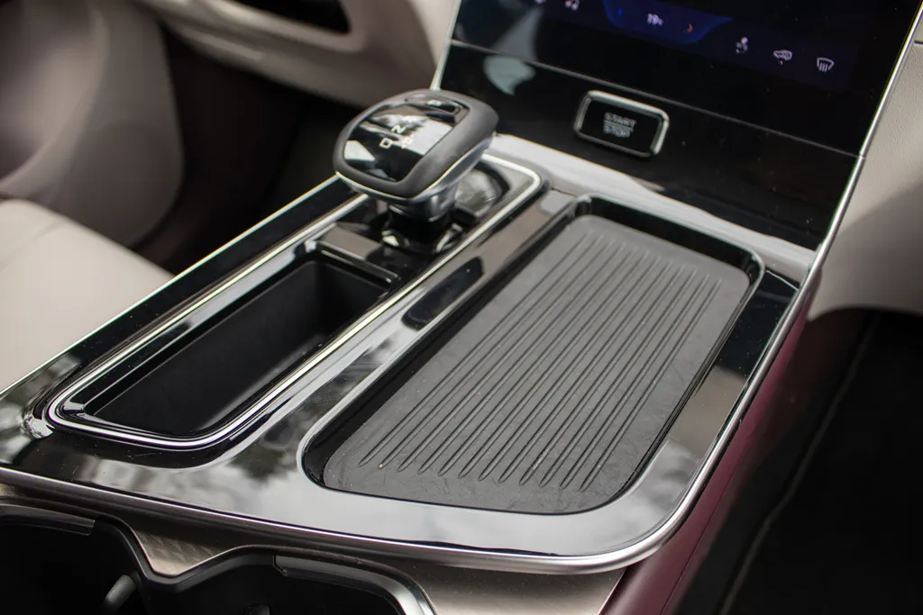Tunel środkowy wpisuje się w stylistykę znaną z wielu chińskich modeli. Jest szeroki i rozbudowany, a na jego powierzchni znajdziemy półkę na telefon, wnękę na kluczyk oraz dwa uchwyty na napoje. Do dyspozycji jest również pojemny schowek z dwoma portami USB, a pod tunelem dodatkowa przestrzeń na drobiazgi. Co ciekawe, w tej dolnej części nie znajdziemy żadnego portu do ładowania.