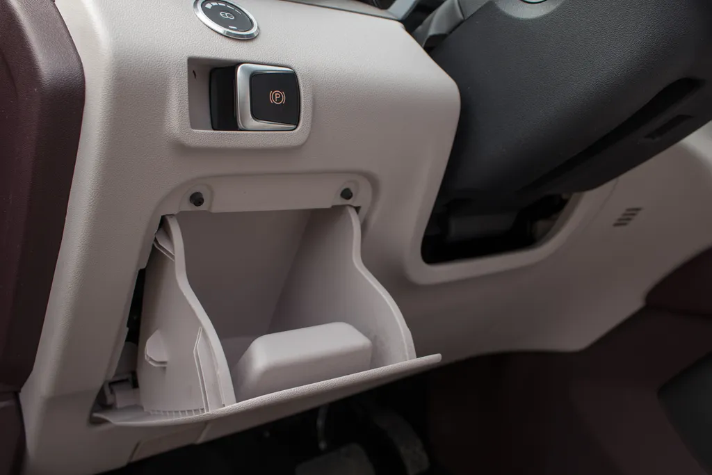 Z lewej strony kierownicy znajdziemy zamykany schowek, nad którym umieszczono przycisk hamulca postojowego oraz przełącznik instalacji LPG.
