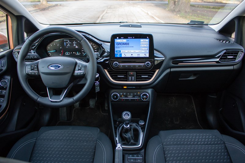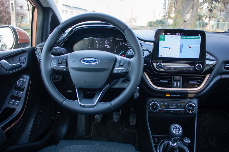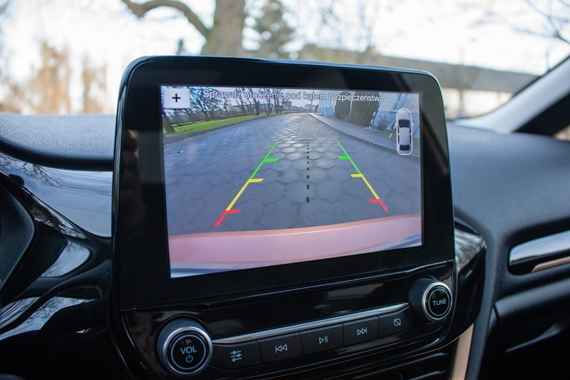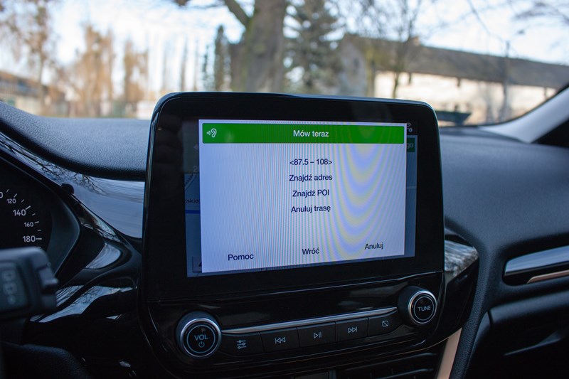 Jedną z największych bolączek poprzedniej Fiesty był system info-rozrywki SYNC 2. Na szczęście przeszedł już do historii a jego miejsce zajął zdecydowanie lepiej dopracowany SYNC 3, który dostępny jest z wyświetlaczem o przekątnej 6.5” lub 8”. W porównaniu do poprzednika jest szybszy, bardziej intuicyjny i lepiej reaguje na dotyk. Do tego obsługę ułatwia sterowanie głosowe, którego nie jesteśmy fanami ale w tym przypadku funkcjonowało naprawdę świetnie. No może czasem potrafiło nas zirytować, bo nie „wyłapało” dokładnie jakiegoś słówka, ale zdarzało się to bardzo rzadko. Komendami głosowymi można zdziałać tutaj naprawdę dużo. Nieco większe uwagi mamy do systemu nawigacji, którego wizualizacje są przejrzyste, ale często potrafi poprowadzić kierowcę nie do końca optymalną trasą.