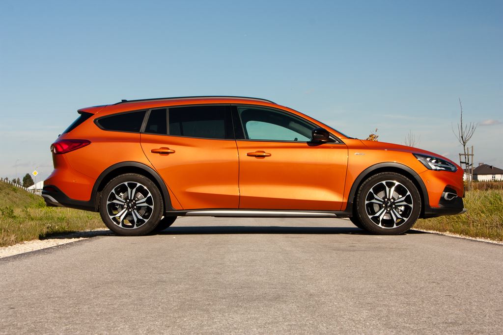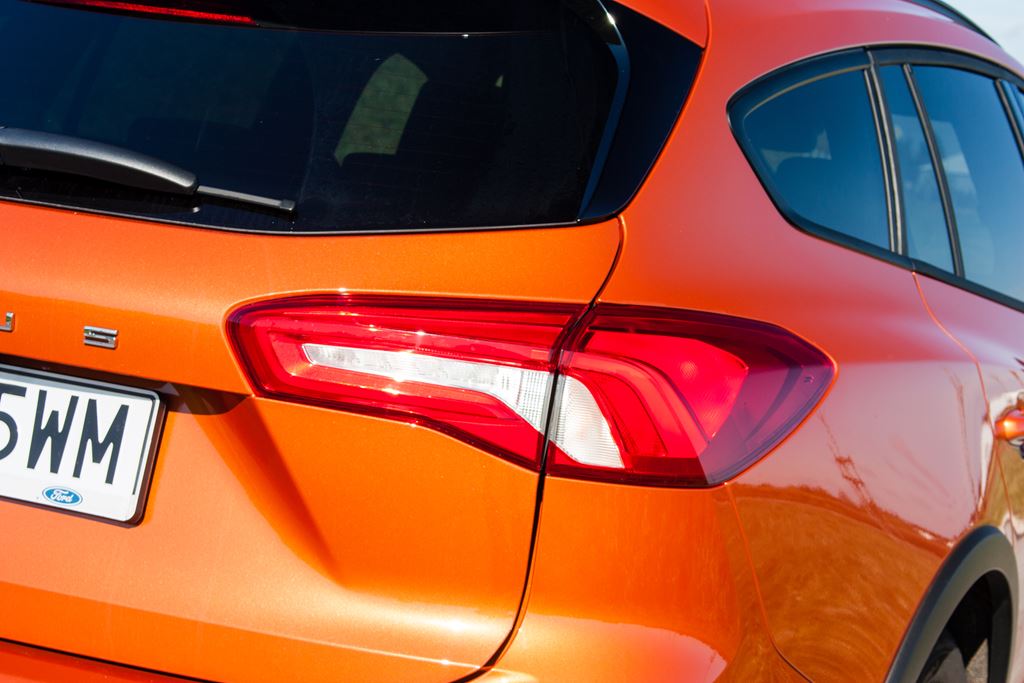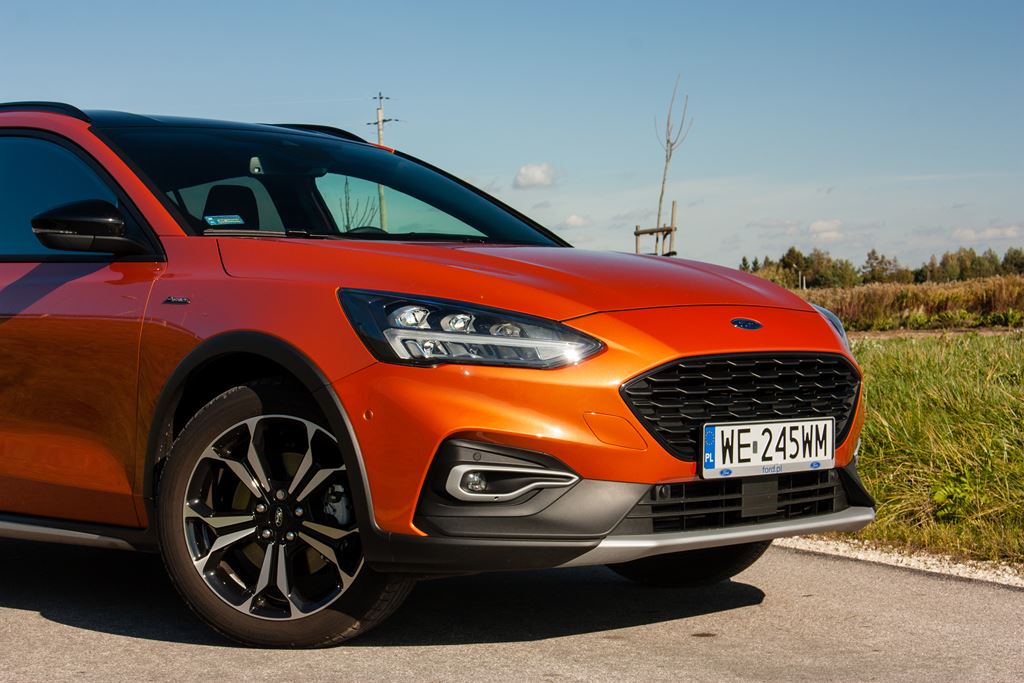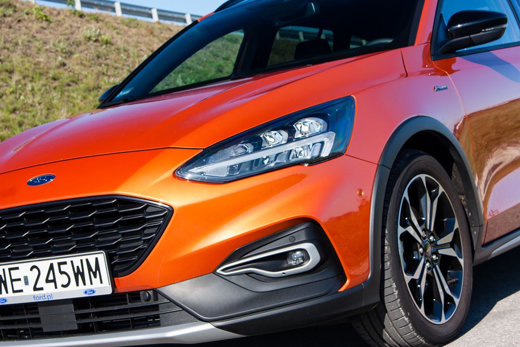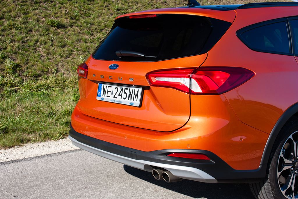 Focus kombi ma pięknie zarysowaną linię nadwozia z licznymi przetłoczeniami, ostrymi rysami i wieloma terenowymi akcentami mającymi upodobnić wersję Active do crossovera. W porównaniu do zwykłej wersji, mamy tutaj specjalny wzór felg, zderzaki w stylizacji Active, listwy progowe i nakładki na błotniki, reflektory automatyczne z tłem w kolorze czarnym czy podwójną końcówkę układu wydechowego w sportowej stylizacji. Trochę plastikowych nakładek, podniesiony prześwit i może troszeczkę krzykliwy kolor sprawiają, że Ford Focus Active prezentuje się wyśmienicie. Zdecydowanie atrakcyjniej i nowocześniej niż normalna odmiana Focusa kombi, która nie ma takiego charakteru.