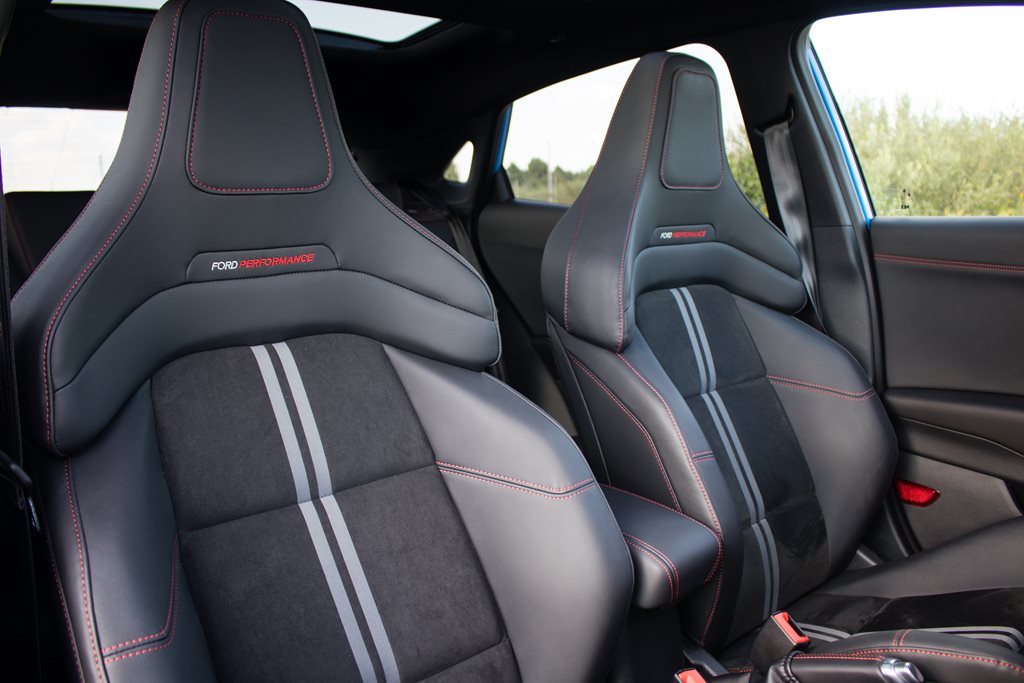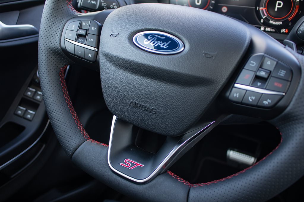 W standardzie otrzymujemy m.in.: system wspomagający kierowcę w unikaniu lub zmniejszaniu skutków kolizji z poprzedzającymi pojazdami lub pieszymi do prędkości maksymalnej 120 km/h, system wspomagający utrzymanie pojazdu na pasie ruchu, system wyboru trybów jazdy, tempomat, zawieszenie performance ST, reflektory statyczne Full LED, system nawigacji satelitarnej z Ford SYNC 3, 8” kolorowy wyświetlacz dotykowy, system nagłośnienia premium B&O, 12,3” wyświetlacz na tablicy zegarów, FordPass Connect z modemem GSM, klimatyzację automatyczną, podgrzewaną przednią szybę, bezprzewodową ładowarkę do smartfonów, czujniki parkowania z przodu i z tyłu, elektrycznie regulowane i podgrzewane lusterka boczne, ściemniające się automatycznie lusterko wsteczne, podgrzewaną kierownicę, kubełkowe fotele Ford Performance, podgrzewane przednie fotele czy 19-sto calowe obręcze kół.