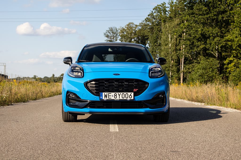 W przedniej części pojawił się agresywniej zarysowany zderzak a także atrapa chłodnicy z motywem plastra miodu, która w wersji ST X została wykończona błyszczącą czernią. Mamy również charakterystyczne przednie reflektory za sprawą których Puma ST wygląda bardzo sympatycznie i oryginalnie. W przypadku naszej wersji były to reflektory statyczne Full LED w stylistyce GT, które świetnie oświetlają drogę. W pozostałych wersjach wyposażenia wymagają one dopłaty 3 950 złotych, ale naszym zdaniem warto do nich dopłacić.