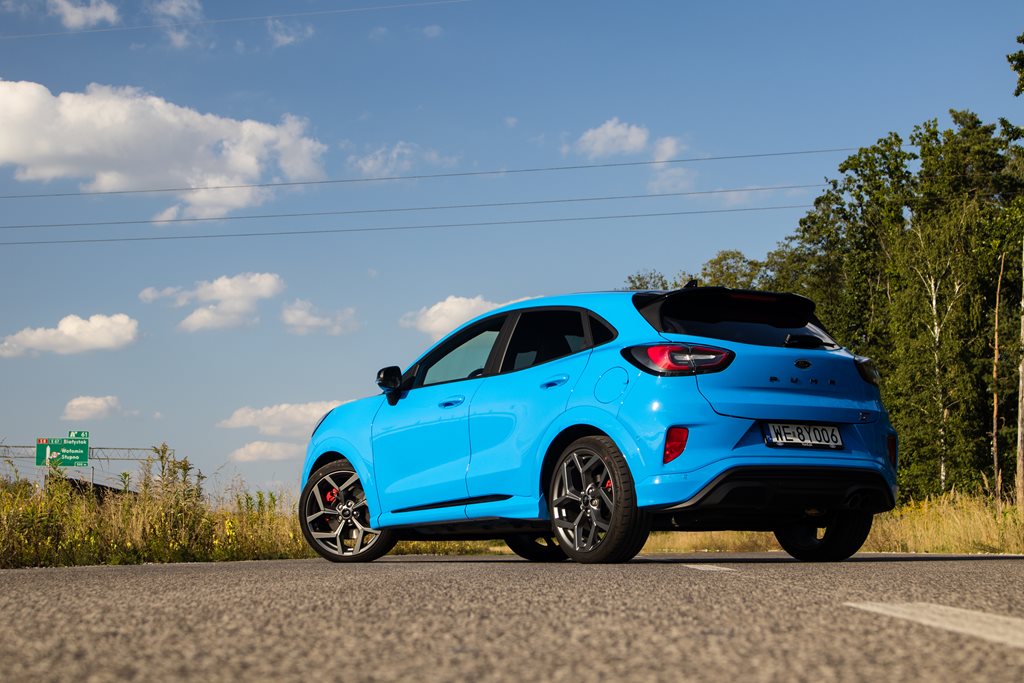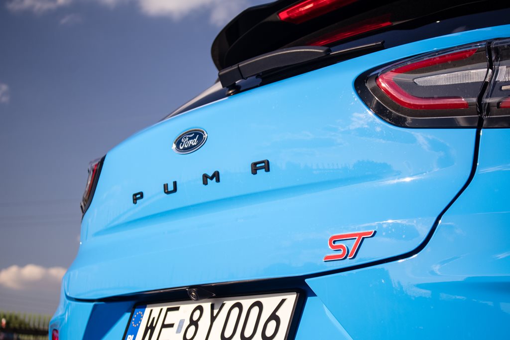 W dolnej części zderzaka pojawiła się maskownica z czarnym wypełnieniem oraz splitter, który zgodnie z deklaracjami Forda zapewnia o prawie 80% większy docisk w porównaniu do zwykłej Pumy. Z tyłu pojawił się dużych rozmiarów spojler dachowy oraz podwójna końcówka układu wydechowego, więc od razu wiadomo, że mamy do czynienia z wersją ST.