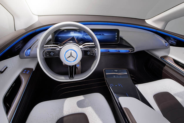 Wnętrze „Generation EQ” charakteryzuje współczesny luksus – a najlepszym tego przykładem jest zupełnie nowy interfejs użytkownika, łączący emocjonujący wygląd z inteligentnym, przyjaznym sterowaniem bez tradycyjnych dźwigni i przełączników. Wyjątkiem są tu typowe dla Mercedesa przyciski elektrycznego sterowania foteli. Na dwóch z trzech smukłych ramion kierownicy znajdują się panele dotykowe zintegrowane z ekranami OLED (OLED – organiczna dioda elektroluminescencyjna). Wskazują one ikony i symbole poszczególnych menu. Kierowca może poruszać się po różnych menu i potwierdzać swój wybór jednym kliknięciem.