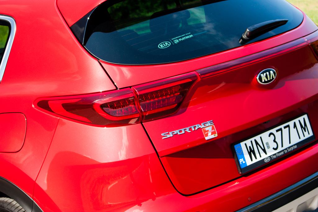 Już na pierwszy rzut oka widać dlaczego Kia Sportage jest tak popularna. Sylwetka kompaktowego SUV-a prezentuje się bardzo nowocześnie i natychmiast przykuwa zainteresowanie. Zwłaszcza masywny przód z dużych rozmiarów atrapą chłodnicy oraz wyłupiastymi reflektorami, które skrywają światła w formie czterech kwadracików. Rozwiązanie, które od razu kojarzy się z Porsche. Podobne kwadraciki znajdziemy również w dolnej części przedniego zderzaka. W tylnej części nadwozia wyróżniają się nowocześnie zarysowane światła, które zostały połączone ze sobą listwą – szkoda, że nie świeci w nocy. Do tego dochodzi sporych rozmiarów spojler dachowy, atrapa dyfuzora i jak najbardziej prawdziwe dwie końcówki układu wydechowego.