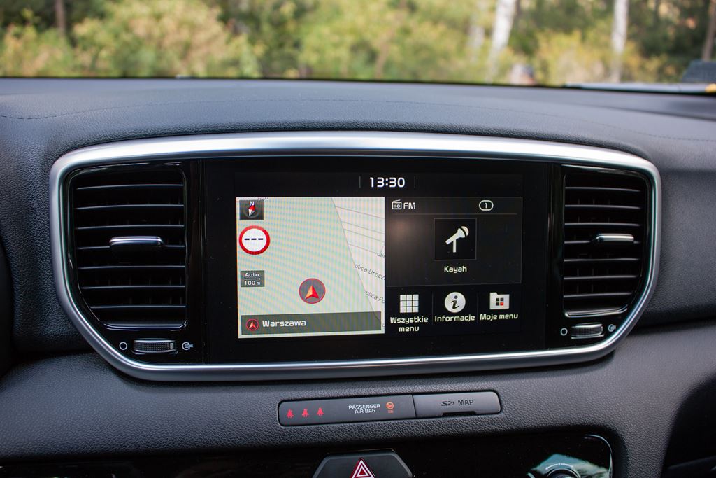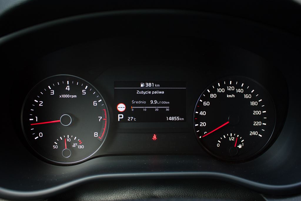 W przeciwieństwie do większości rywali, ekran systemu multimedialnego o przekątnej ośmiu cali jest stosunkowo niewielki. Niewątpliwie zaletą systemu jest szybkość działania i jego intuicyjność, jednak trudno nie oprzeć się wrażeniu, że interfejs jest już przestarzały i niezbyt atrakcyjny. Narzekać można również na jakość obrazu z kamery cofania. Na szczęście system dobrze współpracuje z Android Auto oraz Apple CarPlay. Zupełnie inne wrażenia można odnieść patrząc na zestaw wskaźników na desce rozdzielczej. Kia postawiła na analogowy prędkościomierz i obrotomierz, pomiędzy którymi umieszczono kolorowy wyświetlacz komputera pokładowego o przekątnej 4,2 cala. Może nie da się wyświetlić ogromnej nawigacji, ale za to wszystko jest bardzo eleganckie i przejrzyste. Bardzo się nam to podoba.