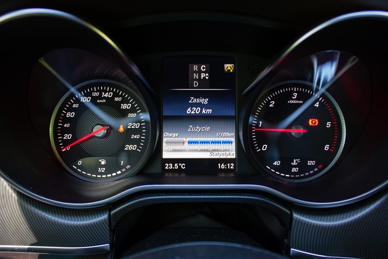 Za kierownicą znajduje się czytelny zestaw zegarów, który został umieszczony w niecodziennie wyglądających tubach. Pomiędzy szybkościomierzem i obrotomierzem zamontowano kolorowy wyświetlacz komputera pokładowego przekazujący kierowcy mnóstwo informacji. Możemy mieć jedynie uwagi, co do chromowanej otoczki tub, która w słoneczny dzień odbija się w zegarach, co da się zauważyć na naszych zdjęciach.
