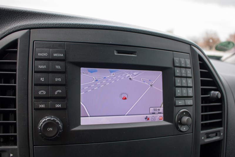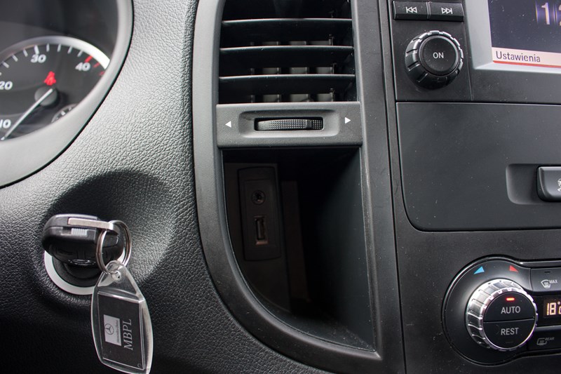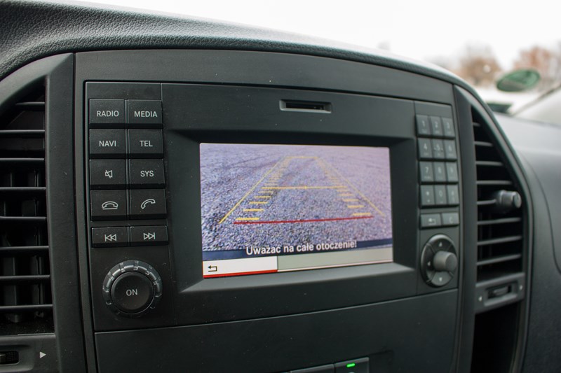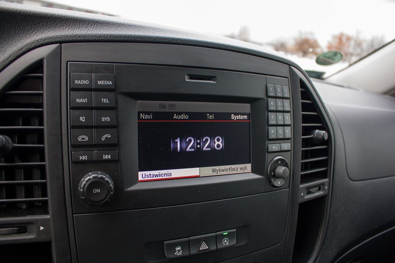 W centralnym punkcie deski rozdzielczej umieszczono niewielki ekran systemu multimedialnego, który jak na rozmiary samochodu wygląda bardzo skromnie. W tym samym miejscu w klasie V montowany jest system Command Online, który odpowiada za obsługę nawigacji, systemu audio, filmów czy internetu. W Vito system jest zdecydowanie mniej rozbudowany i łatwiej się w nim połapać, chociaż momentami potrafi sprawić kierowcy mnóstwo problemów. W czasie naszego testu wielokrotnie to pasażer musiał przejmować rolę pilota, bo wprowadzanie danych do nawigacji w czasie jazdy było praktycznie niemożliwe. Nieco niżej umieszczono panel klimatyzacji, który jest bardzo prosty w obsłudze. Problemem może być jedynie cena. Zaglądając do specyfikacji zobaczyliśmy, że za klimatyzację automatyczną Thermotronic trzeba zapłacić 7.685 złotych! Półautomatyczna klimatyzacja z tyłu to dodatkowe 2.489 złotych.