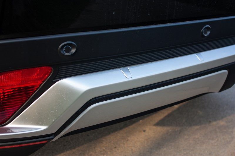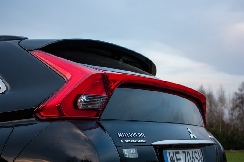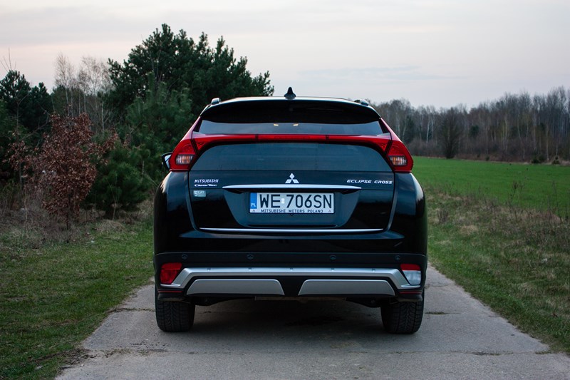 Idąc dalej dochodzimy do najbardziej kontrowersyjnej części Eclipse Cross. Nawet nie będziemy próbowali oceniać czy dziwaczny tył jest ładny czy brzydki. Na pewno zwraca na siebie uwagę. Szkoda tylko, że przedzielenie tylnej szyby czymś w rodzaju dodatkowego spojlera ze zintegrowanymi światłami ma swoje negatywne konsekwencje w zakresie widoczności. A przynajmniej nam to przeszkadza, bo innym jakoś nie robi różnicy to, że przez środek tylnej szyby przebiega sporych rozmiarów element, który znacząco ogranicza to co widzimy we wstecznym lusterku.
