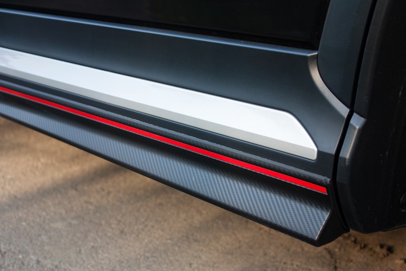 W dalszej części widać lekkie nawiązanie do coupe, natomiast dodatkowej zadziorności nadają ostre linie i wyraźne przetłoczenia ożywiające boczną część nadwozia. Miłym akcentem są czerwone listewki na progach oraz srebrne wstawki kontrastujące z kolorem nadwozia. Niby drobnostka a robi fajny efekt.