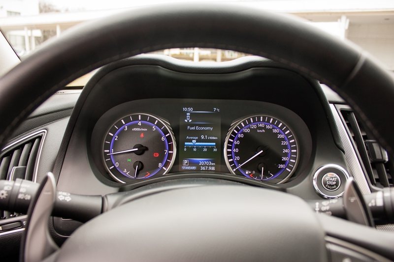 Infiniti Q50 dynamicznie przyspiesza, doskonale się prowadzi, skrzynia biegów reaguje natychmiastowo a przyspieszenie sprawia, że na naszych twarzach pojawiał się uśmiech. Przy dynamicznej jeździe do której zachęca limuzyna spalanie w trybie miejskim dochodziło do 12-13 litrów, natomiast bardziej agresywna jazda poza miastem sprawiała, że na komputerze pokładowym przy informacji o zużyciu paliwa pojawiała się cyfra 9.2 litra na każde sto kilometrów. W czasie spokojnej jazdy i przy delikatnym obchodzeniu się z pedałem gazu w mieście udawało się uzyskać spalanie na poziomie 8.5 litra, natomiast w cyklu pozamiejskim spadało ono do 7.1 litra benzyny na każde przejechane sto kilometrów. Zdaniem producenta szacunkowe średnie zużycie paliwa powinno wynosić 6.2 litra, jednak nam takich wartości osiągnąć się nie udało.