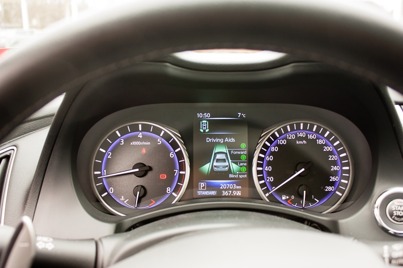 Wsiadając do Infiniti Q50 pierwszymi skojarzeniami jakie się nasuwają to, że mamy kontakt z luksusową marką związaną z koncernem Nissana. Mam tutaj na myśli przede wszystkim wygląd deski rozdzielczej, na której znajdziemy dobrze znany z samochodów Nissana układ wskaźników przedzielony ekranem komputera pokładowego.