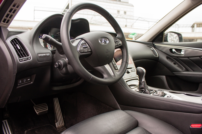 Infiniti Q50 oferowany jest na polskim rynku z jednostką wysokoprężną o pojemności 2.2 litra i mocy 170 koni mechanicznych, w wersji hybrydowej z silnikiem benzynowym o pojemności 3.5 V6 i łącznej mocy 364 koni mechanicznych oraz z tradycyjną jednostką benzynową o pojemności 2.0 osiągającą moc 211 koni mechanicznych. Testowana przez nas limuzyna wyposażona została w ostatnią wymienioną jednostkę, którą przenosiła moc za pomocą siedmiobiegowej automatycznej skrzyni biegów na tylne koła. Pomimo tego, że nie jest to najnowsza konstrukcja to spisuje się bardzo dobrze, po wciśnięciu kick-down, skrzynia szybko redukuje biegi dając kierowcy optymalną moc i moment obrotowy do wyprzedzania. Słyszałem trochę negatywnych ocen dotyczących tej skrzyni, jednak absolutnie się z nimi nie zgadzam.