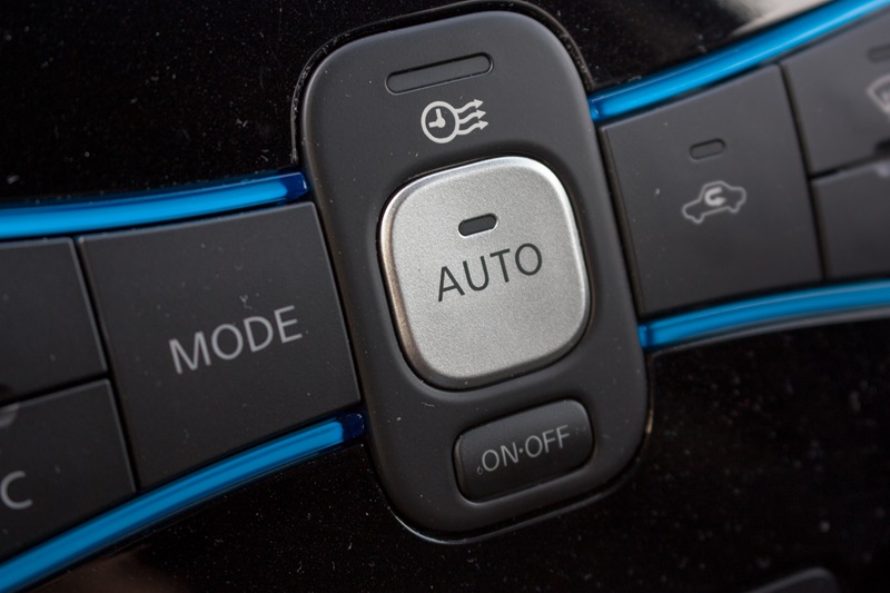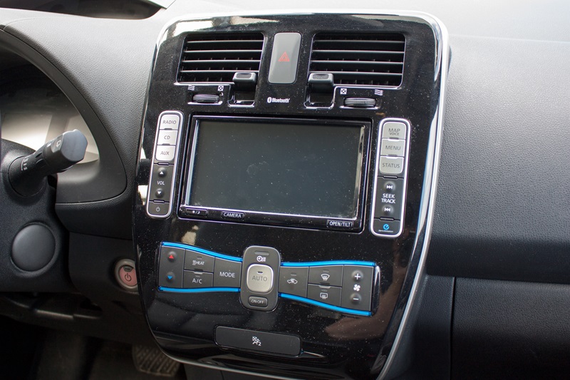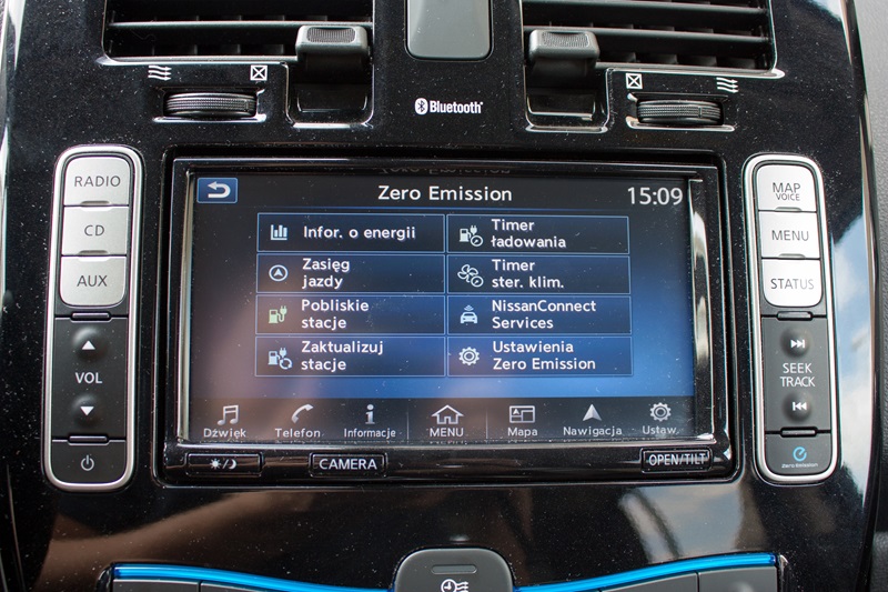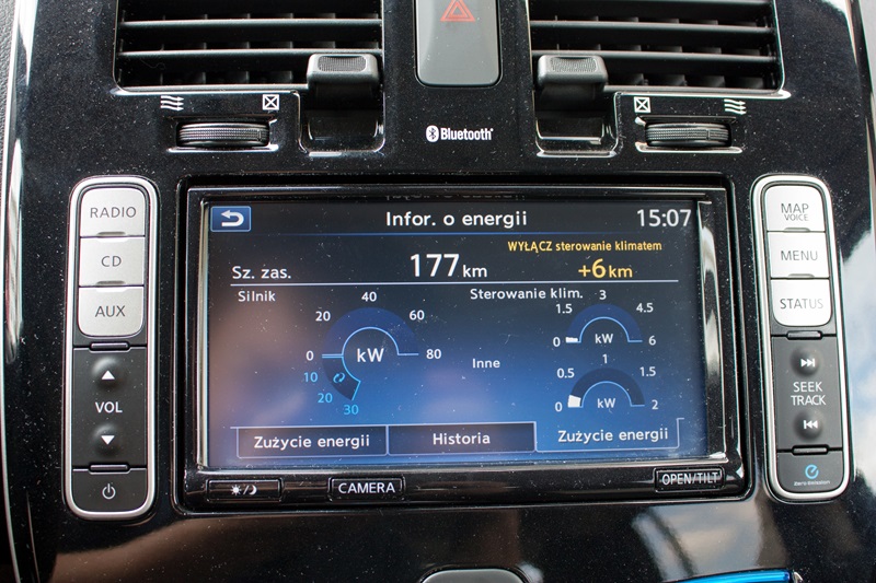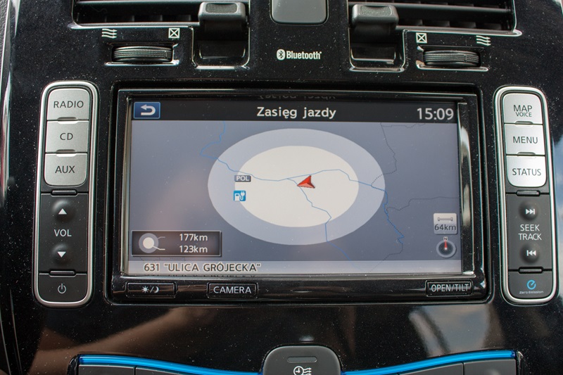 Na konsoli centralnej zamontowano pokaźnych rozmiarów panel pokryty błyszczącym plastikiem. Wygląda to trochę tak jakby zapomniano go przymocować na linii montażowej i później ktoś zrobił to trochę byle jak. Mamy tutaj system nawigacji NissanConnect EV 2.0 z siedmiocalowym ekranem dotykowym, który jest prawdziwym centrum zarządzania elektrycznym samochodem i dostarcza mnóstwa interesujących informacji. Możemy dzięki niemu sprawdzić w jaki sposób wykorzystywana jest energia z naszych akumulatorów, dowiedzieć się gdzie je naładujemy a na mapie zobaczymy do jakiego miejsca możemy dojechać na pozostałej w nich energii. Możemy zaplanować harmonogram ładowania, nagrzewania i chłodzenia samochodu, a to pozwoli zwiększyć zasięg. Niżej znajduje się panel klimatyzacji.