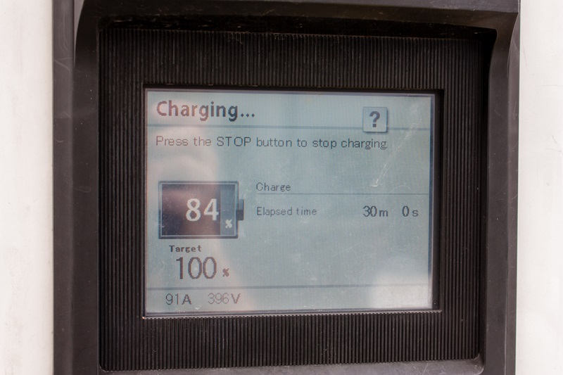 Ostatnim sposobem jest korzystanie z publicznych punktów szybkiego ładowania. To nie tylko darmowa metoda ładowania, ale także najszybsza. Umożliwia naładowanie akumulatorów do poziomu 80 % w czasie około 30 minut i jak kilkukrotnie się o tym przekonaliśmy jest to prawdą. Problem w tym, że takich punktów jest jak na lekarstwo. Testowy egzemplarz ładowaliśmy pod salonem Nissana dzięki ładowarce o mocy 44 kW. W czasie 45 minut nasze akumulatory napełniały się do 95 – 96 % co pozwalało na przejechanie około 200 kilometrów. Na dłuższą metę jest to oczywiście bardzo uciążliwe. Zapomnielibyśmy o jeszcze jednej istotnej sprawie. Nie wszystkie punkty umożliwiają szybkie naładowanie akumulatorów, natomiast niektóre wymagają zakupu specjalnych przejściówek.