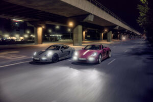Nawet jeśli nowe warianty 718 Style Edition zostaną zamówione w innym kolorze niż Ruby Star Neo, i tak zdecydowanie wyróżniają się wzornictwem. Na przykład jeżdżą na kołach z 20-calowymi obręczami 718 Spyder w kolorze czarnym, z lśniącym wykończeniem, a osłony piast zdobi w pełni kolorowy herb Porsche. Specjalną edycję można rozpoznać również za sprawą czarnych, sportowych końcówek układu wydechowego oraz srebrnego, błyszczącego napisu „PORSCHE”. Ekskluzywną wizytówką 718 Boxster Style Edition jest napis „Boxster” wytłoczony po obu stronach miękkiego dachu, nad bocznymi szybami. Ponadto klienci mogą bez dodatkowych opłat wybrać jeden z dwóch pakietów 718 Style Edition z elementami w kontrastowym kolorze – czarnym lub białym. Obejmują one ozdobne pasy na pokrywie bagażnika z przodu oraz dekoracyjne boczne napisy „PORSCHE”, a także lakierowane, białe lub czarne, wykończenie obręczy i oznaczenia modelu z tyłu o wysokim połysku. W kabinie warianty Style Edition zwracają uwagę pakietem wykończenia skórą w kolorze czarnym, z kontrastującymi przeszyciami w kolorze Crayon, podświetlanymi nakładkami progów drzwi ze stali nierdzewnej oraz herbem Porsche wytłoczonym na zagłówkach.