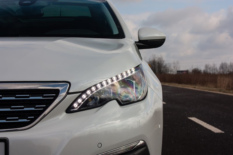 Nie przepadamy za jasnymi lakierami, ale trzeba przyznać, że Peugeot 308 SW pokryty lakierem perłowym Biały Nacre prezentuje się wyjątkowo dobrze i świetnie pasuje do sylwetki nadwozia. Podkreślają ją ostre zarysowania, agresywnie zaprojektowane przednie reflektory i pionowa atrapa chłodnicy. Wszystko znakomicie współgra z obłymi kształtami, chromowanymi elementami i czarnym wykończeniem dolnej części zderzaka. Peugeot 308 SW wygląda nowocześnie i bardzo agresywnie, co z pewnością rozbudza apetyt kierowców lubiących bardziej dynamiczną jazdę. Francuzi nie zapomnieli o dodatkach podkreślających charakter samochodu. Animowane kierunkowskazy czy ciekawie ułożony pasek LED-ów do jazdy dziennej dają zaskakująco dobre efekty.