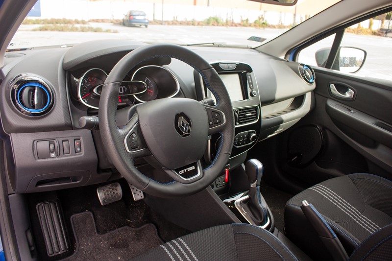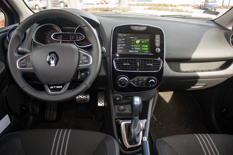 Wnętrze Clio jest zdecydowanie mniej intrygujące, chociaż dzięki pakietowi stylistycznemu pojawiły się w nim pewne elementy poprawiające jego wygląd. Sportowego charakteru nadają sportowa skórzana kierownica z oznakowaniem GT Line, ozdobne elementu i przeszycia w kolorze niebieskim oraz aluminiowe pedały. To wszystko robi naprawdę fajne wrażenie a elementem dzięki któremu możemy poczuć się jak w wyścigowym samochodzie są sportowe fotele ze wzmocnionymi podparciami bocznymi obszyte specjalną tapicerką GT Line, które świetnie trzymają ciało w czasie agresywnego pokonywania zakrętów – duża zaleta w trakcie zabawy, ale w codziennym użytkowaniu potrafią być nieco zbyt ciasne i twarde.