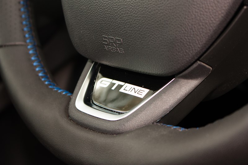 Pakiet GT-Line zawiera zderzak tylny, chromowaną końcówkę rury wydechowej, spojler dachowy i spojlery progowe Renault Sport, elementy ozdobne w kolorze ciemnoszarym oraz boczne listy ochronne drzwi w kolorze nadwozia. Bardzo fajny efekt dają również kolor Niebieski Iron oraz 17” obręcze ze stopów lekkich.