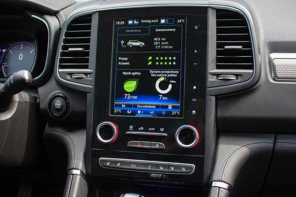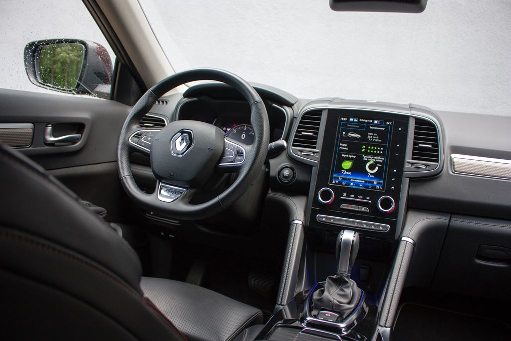 Jeśli chodzi o design wnętrza to w wielkim skrócie – to stare dobre Renault. Daleko mu do jakości znanej z najnowszych modeli francuskiej marki, ale wszystko jest uporządkowane, funkcjonalne i ergonomiczne. W centralnym punkcie umieszczono wyświetlacz systemu multimedialnego R-Link 2 o przekątnej 8,7 cala, który działa zbyt wolno i ma już nieco przestarzały interfejs. Od czasu do czasu system potrafi się przywiesić, ale do tego zdążyliśmy się już przyzwyczaić. Zresztą w najnowszych modelach mamy już system Easy Link, który jest o lata świetlne bardziej nowoczesny od R-Link 2. Być może taki system trafi również do Renault Koleos. Mimo wszystko, przy tych wszystkich wadach, system jest prosty w obsłudze i skuteczny. To co ucieszy wszystkich zwolenników ergonomii to dedykowany panel klimatyzacji oraz ustawień podgrzewania i wentylowania foteli.