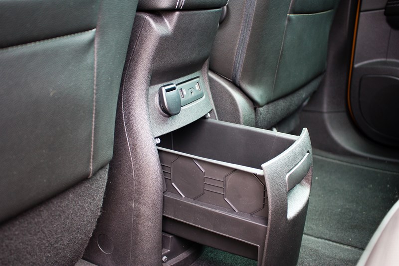 Przesuwana środkowa konsola to naprawdę fajne rozwiązanie, jednak nie jest bez wad. Posiada ona podświetlany i zamykany żaluzją schowek oraz wbudowany podłokietnik. Wbudowano w niego dwa gniazda USB i jedno typu Jack. Na tylnej ściance znajdziemy jedno gniazdo 12 V, dwa gniazda USB i jedno typu Jack. Tuż przy podłodze znajduje się wysuwany schowek.