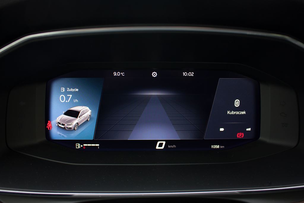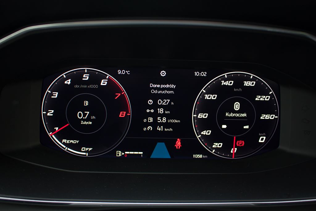 Rezygnacja z większości przycisków i przełączników musiała oznaczać przeniesienie sterowania poszczególnymi funkcjami do komputera pokładowego oraz systemu info-rozrywki. Wirtualny kokpit z wyświetlaczem o przekątnej 10,25 cala stanowi element wyposażenia seryjnego w dwóch najwyższych wersjach wyposażenia Xcellence i FR, natomiast w Style i Full LED wymaga dopłaty 1 719 złotych. Obsługa obywa się za pomocą przycisków umieszczonych na kierownicy i musimy przyznać, że jest ona szybka i intuicyjna. Do wyboru jest kilka predefiniowanych widoków, których zawartość można w pewnym stopniu zmieniać, dzięki czemu przed oczami kierowcy znajdą się najbardziej potrzebne informacje. Nie mielibyśmy do niego uwag, gdyby nie to, że ktoś kompletnie nie przemyślał wyskalowania cyfrowego prędkościomierza, który obecnie jest bezużyteczny i nieczytelny.