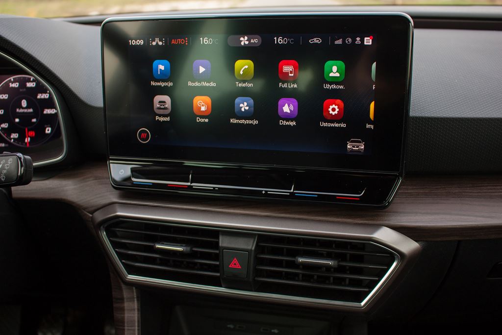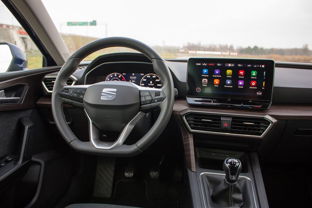 Olbrzymią metamorfozę w porównaniu do poprzedniej generacji przeszła kabina pasażerska, która jest teraz bardziej uporządkowana, minimalistyczna i nowoczesna. Projektanci ograniczyli ilość fizycznych przycisków i przełączników do absolutnego minimum, dzięki czemu wnętrze prezentuje się przejrzyście i elegancko, jednak ma swoje konsekwencje jeśli chodzi o ergonomię. Ten temat poruszymy za chwilę, ponieważ na razie chcielibyśmy się skupić na ogólnym wykończeniu nowego Seata Leona. I tutaj pojawia się pierwszy zgrzyt, ponieważ jakość wykończenia jest przeciętna. Z jednej strony w górnych partiach mamy do czynienia z miękkimi i przyjemnymi w dotyku elementami, natomiast oświetlenie ambientowe składa się w pasa oświetleniowego, który umieszczono na podszybiu. W nocy wygląda to bardzo efektownie, chociaż w czasie nocnej jazdy po autostradzie lepiej go wyłączyć, ponieważ trochę rozprasza. W oświetlenie ambientowe wkomponowano także sygnalizację systemu monitorowania martwego pola, co naszym zdaniem jest świetnym rozwiązaniem. Na drugiej szali mamy plastikowy dekor mający imitować drewno oraz zbyt dużą ilość kiepskiej jakości tworzyw, które co prawda zostały bardzo dobrze spasowane, jednak naszym zdaniem w takich miejscach jak uchwyty do zamykania drzwi należałoby użyć czegoś znacznie lepszego.