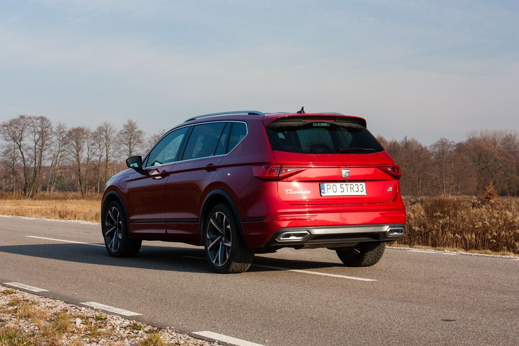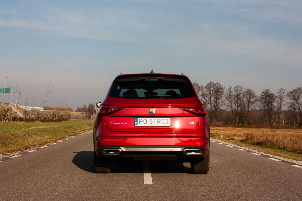 Wcześniej również gościliśmy w naszym garażu Seata Tarraco w wersji FR, jednak tamten egzemplarz miał ciemny lakier przez co zupełnie nie rzucał się w oczy. Co prawda prezentował się atrakcyjnie, ale naszym zdaniem czegoś w nim brakowało. Tego czegoś nie brakowało już w prezentowanym egzemplarzu, który naszym zdaniem został zdecydowanie lepiej skonfigurowany dzięki czemu wyglądał wyjątkowo dobrze. Podstawą jest specjalny lakier Merlot Red, który w połączeniu z 20-sto calowymi obręczami kół, większym spojlerem, przemodelowanym tylnym zderzakiem czy przyciemnianymi szybami sprawia, że Seat Tarraco jest bardziej zadziorny i dynamiczny.