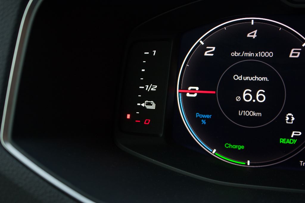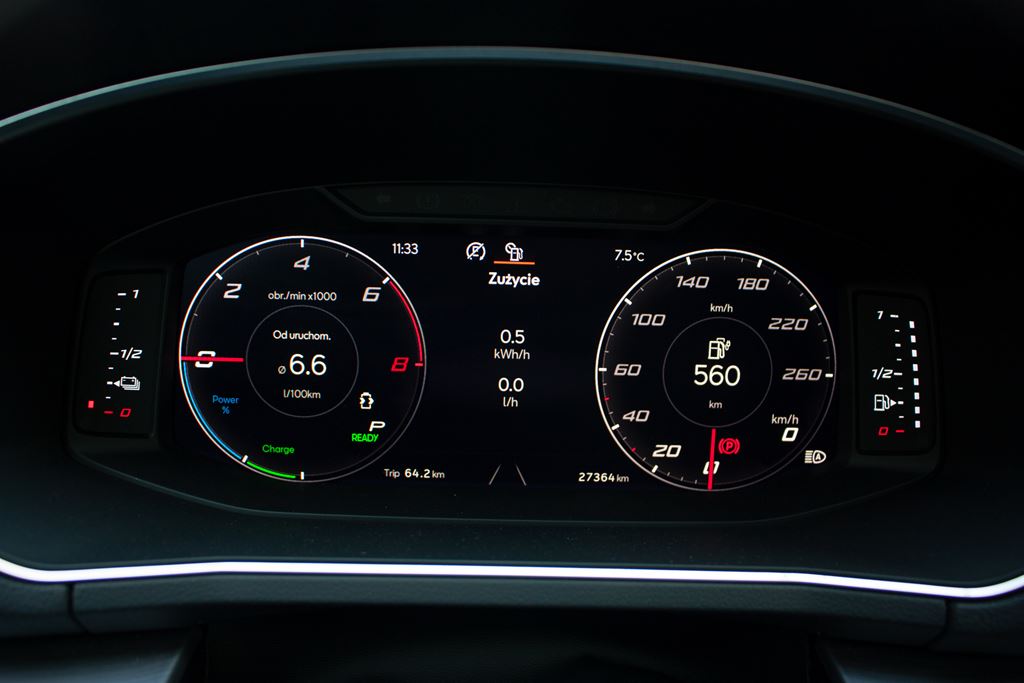 Baterie mają pojemność 13 kWh. Można je naładować z szybkiej ładowarki w około 3,5 godziny lub z domowego gniazdka w około 5 godzin. Teoretycznie w pełni naładowana bateria powinna wystarczyć na przejechanie 45 – 48 kilometrów, jednak w czasie naszego testu temperatury były dalekie od optymalnych co wyraźnie przekładało się na zasięg. W efekcie na pełnej baterii udawało się nam przejechać 30 – 35 kilometrów. W zimę będzie jeszcze gorzej, ale pewnie wiosną można liczyć na uzyskanie 40 kilometrowego zasięgu. Oczywiście wszystko zależy od natężenia ruchu i dynamiki jazdy, bo Tarraco swoje waży i rozpędzenie takiego SUV-a wymaga sporo energii. Na szczęście nawet po wyczerpaniu prądu w baterii Seat Tarraco okazuje się być zaskakująco oszczędny. Wówczas w mieście możemy liczyć na zużycie w okolicach 6,5 – 7,5 litra, a to wszystko dzięki bardzo dobrze działającemu systemowi odzyskiwania energii. Trochę gorzej będzie na ekspresówce gdzie Tararco zużywa około 8 litrów, natomiast na autostradzie będzie to około 10 litrów. W trasie problemem może być zasięg, ponieważ pojemność zbiornika paliwa wynosi 45 litrów, co przekłada się na jakieś 400 – 500 kilometrów w trasie.