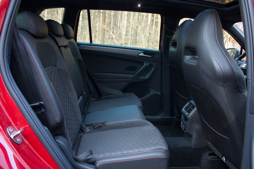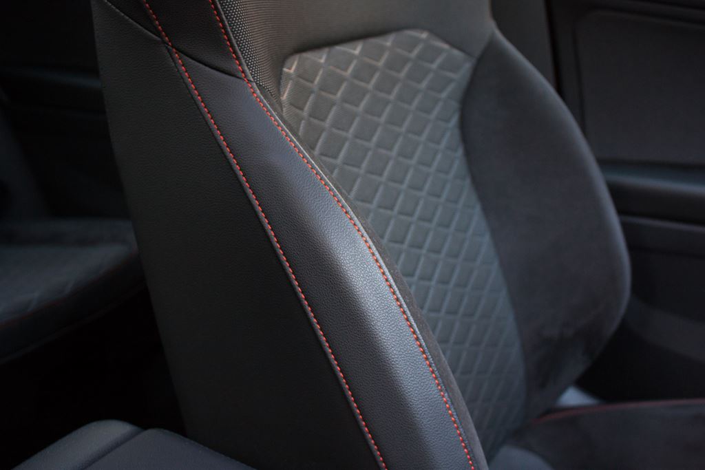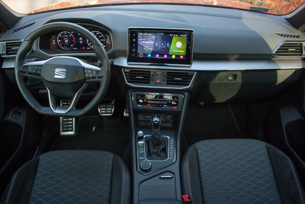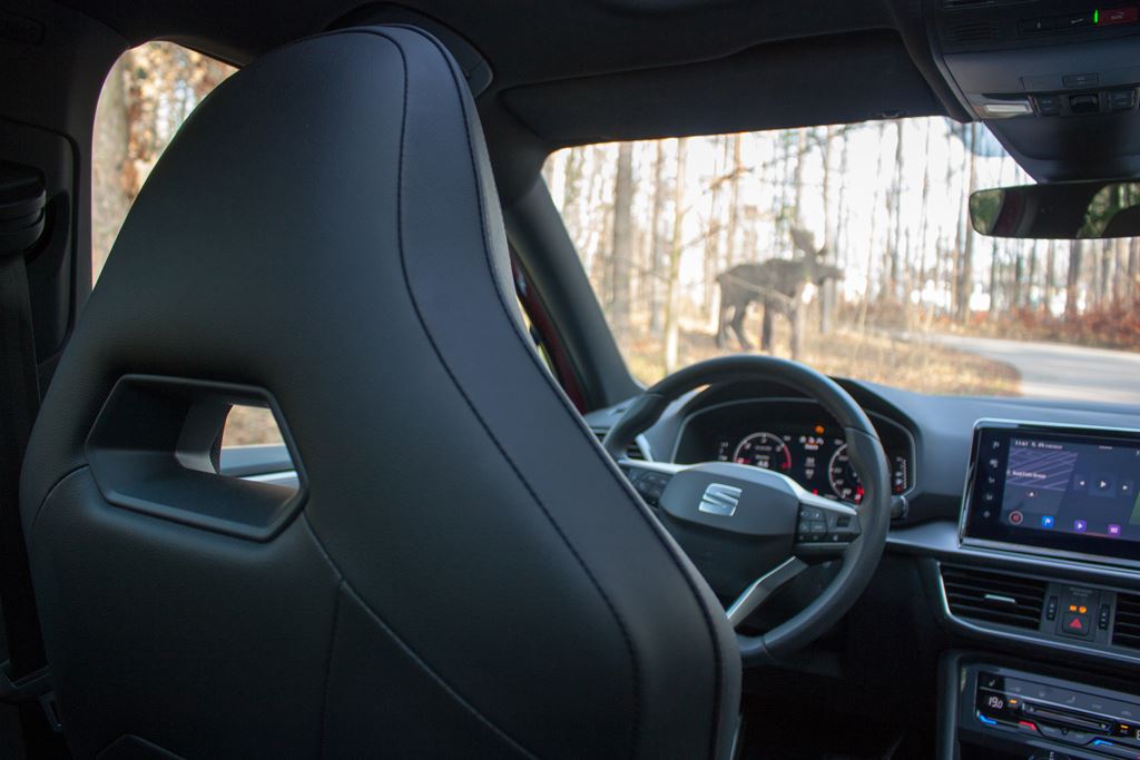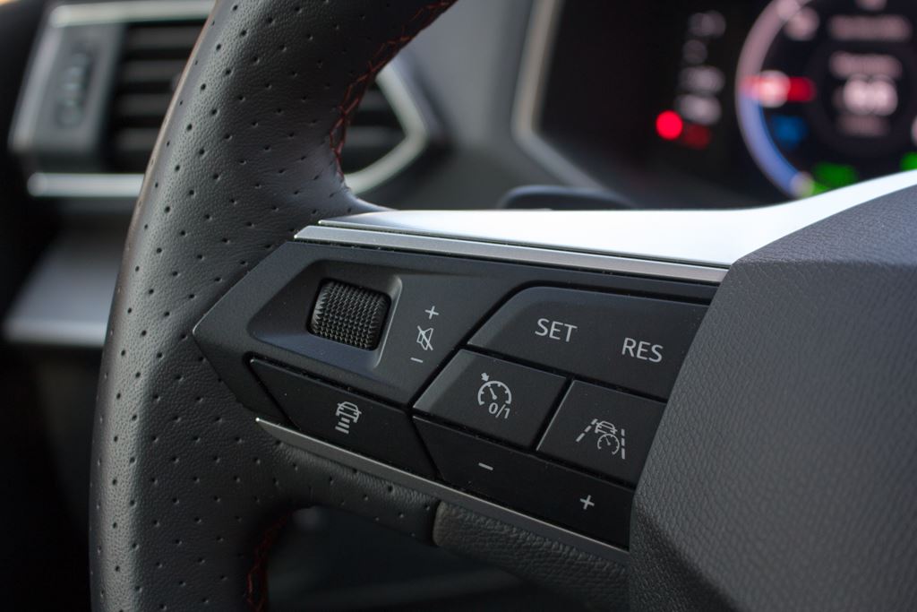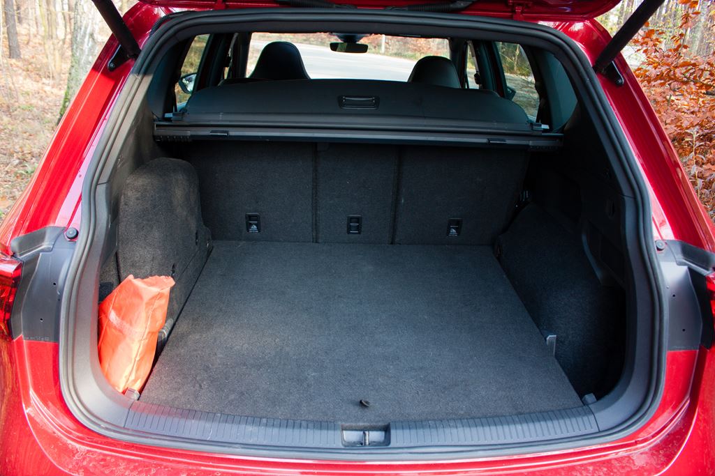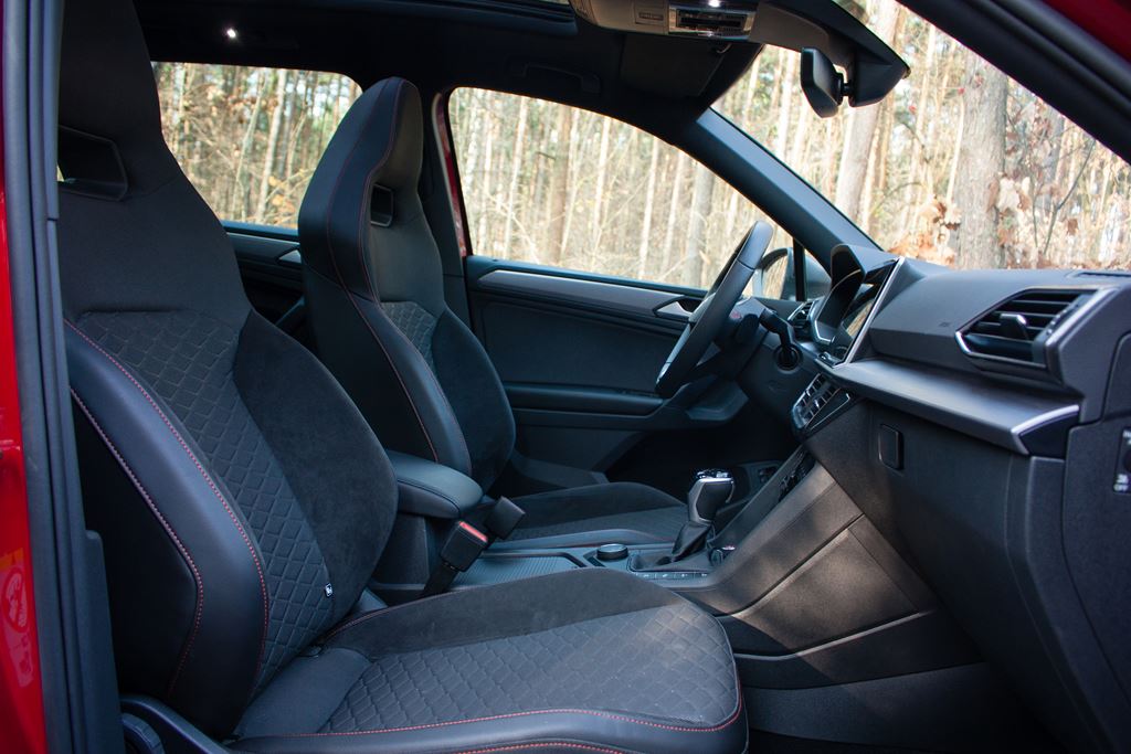Wnętrze również nie zawodzi i nie brakuje w nim sportowych akcentów. Z pewnością najważniejszym elementem są kubełkowe fotele FR z elementami Alcantary, które nie tylko znakomicie wyglądają, ale zapewniają także bardzo dobre trzymanie w zakrętach. Wbrew pozorom są one bardzo komfortowe i świetnie sprawdzają się w czasie codziennej jazdy. Poza tym znajdziemy tutaj także czerwone przeszycia, listwy dekoracyjne imitujące szczotkowane aluminium, sportową wielofunkcyjną kierownicę czy elementy dźwigni zmiany biegów obszyte skórą z czerwonym przeszyciem. Tylna kanapa jest dość płaska i nie ma już tak wyraźnego wyprofilowania, ale siedziska mają odpowiednią długość a regulacja oparcia pozwala na dostosowanie pochylenia kanapy do oczekiwań pasażerów. Warto podkreślić, że w wersji hybrydowej nie ma możliwości zamontowania trzeciego rzędu siedzeń. Na szczęście bagażnik ma pokaźną pojemność 610 litrów i to coś co należy wyraźnie podkreślić, bowiem przyzwyczailiśmy się, że wersje hybrydowe tracą swoją praktyczność. A tutaj proszę. Mamy napęd hybrydowy a bagażnik w Tarraco wciąż jest ogromny.
