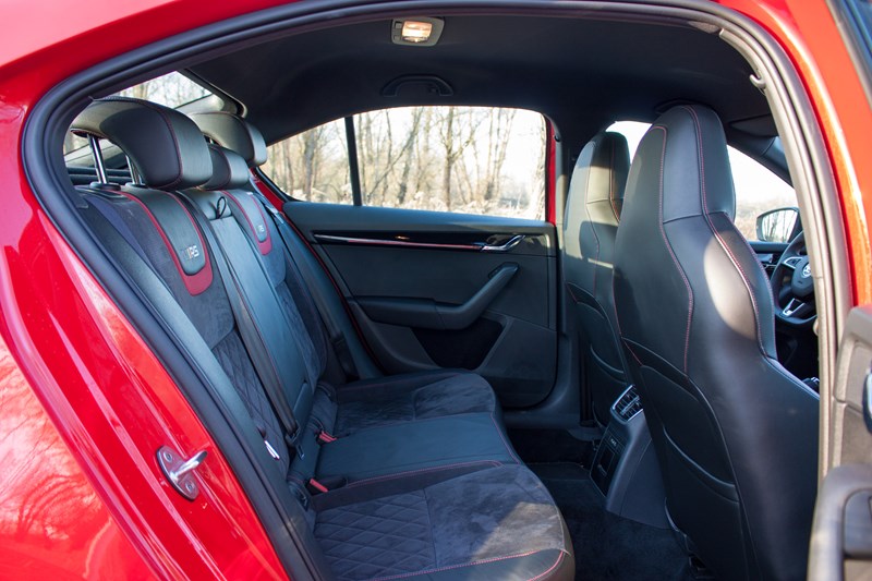 Na tylnej kanapie jest naprawdę dużo miejsca, ale dość szybko można zauważyć, że przewidziano tutaj dwa komfortowe wgłębienia i awaryjne środkowe miejsce, które najlepiej spełnia się w roli szerokiego podłokietnika. Wówczas pasażerowie mogą się wygodnie rozsiąść i rozkoszować jazdą. Tym bardziej, że środkowy tunel poprowadzono dość wysoko a to nie ułatwia zajęcia miejsca na środkowym siedzisku. Na tylnej kanapie nie zabrakło ozdobnych elementów przypominających nam o tym, że podróżujemy wyjątkową odmianą Octavii, nawiewów czy portów USB.