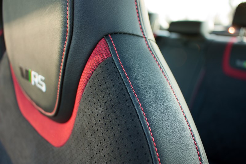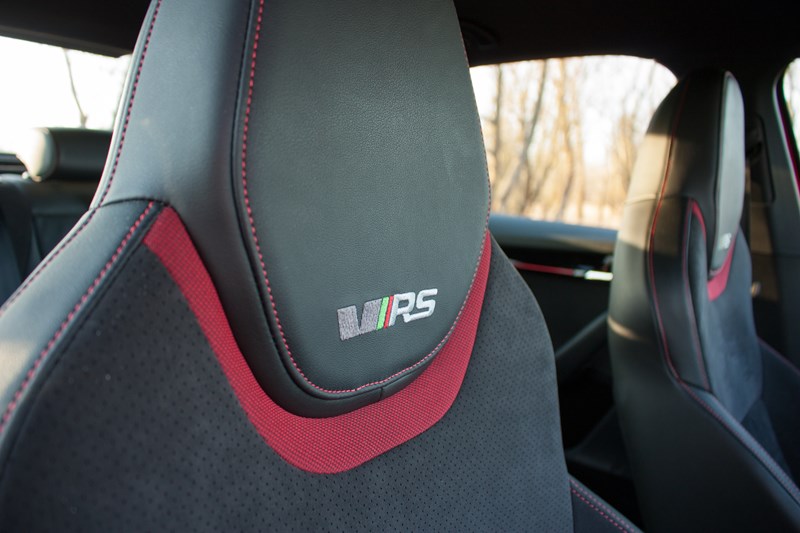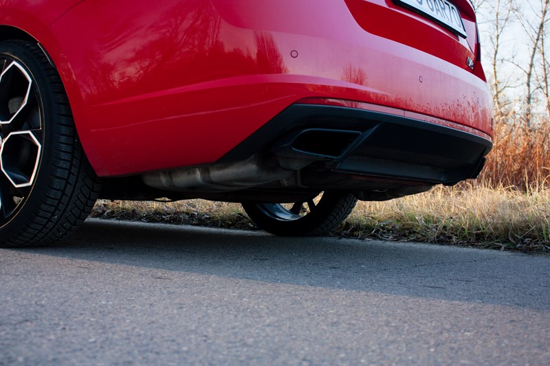 Testowany przez nas egzemplarz pokryty krwistoczerwonym lakierem świetnie komponował się z czarnym kolorem listew okiennych, atrapy chłodnicy oraz szerokiego pasa w dolnej części przedniego zderzaka. W najbardziej sportowej wersji RS nie mogło zabraknąć charakterystycznych oznaczeń VRS, które umieszczano na grillu oraz klapie bagażnika. W tylnej części nadwozia zamontowano podwójną końcówkę układu wydechowego i okazały spojler, który poprawia właściwości jezdne przy dużych prędkościach. Przysłowiową wisienką na torcie są 19-calowe obręcze ze stopów lekkich o wzorze XTREME. Dzięki temu już z daleka widać, że to coś więcej niż tylko rodzinny samochód.