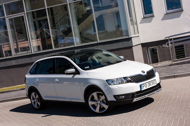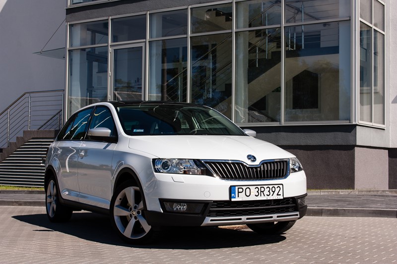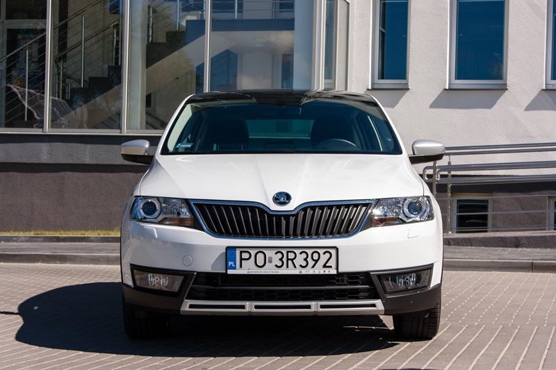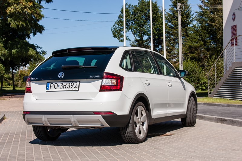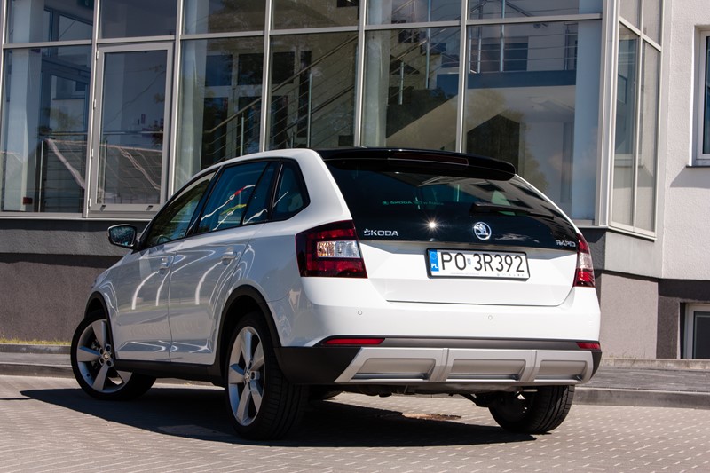 Na pierwszy rzut oka testowany egzemplarz wygląda modnie i nowocześnie, a zestaw plastikowych nakładek dodaje mu atrakcyjnego i agresywnego wyglądu. W porównaniu do standardowej edycji Skody Rapid, w przypadku Scoutline pojawiły się zderzaki wykończone dekoracyjnymi elementami ochronnymi, dyfuzorem o powierzchni w kolorze srebrnym refleksyjnym oraz plastikowymi osłonami nadkoli oraz progów. W skład pakietu wchodzą srebrne 16-calowe obręcze kół ze stopów lekkich „Rock” lub opcjonalne 17-calowe obręcze „Camelot”. Zewnętrzne obudowy lusterek zostały wykończone w kolorze srebrnym. Prasowy Rapid został pokryty białym lakierem, który bardzo dobrze komponował się z panoramicznym dachem, chociaż lepszy efekt dałyby większe obręcze kół.