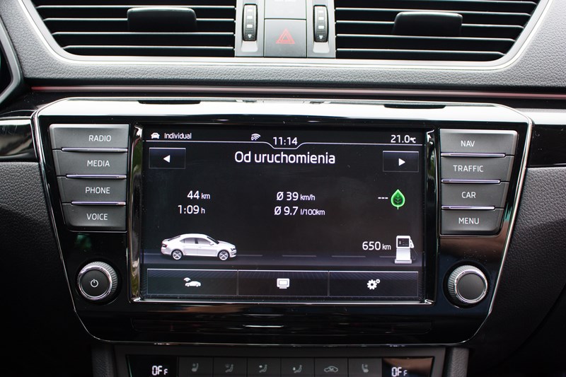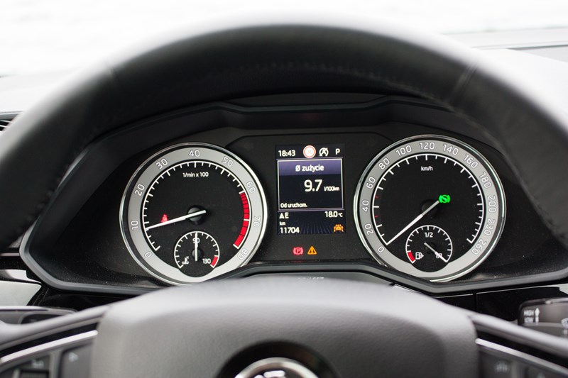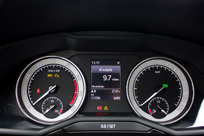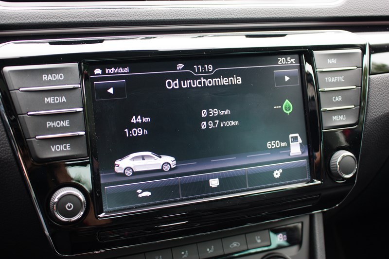 Tak mocny silnik musi też swoje wypić. Według producenta Superb z silnikiem 2.0 TSI 280 KM powinien zużywać w mieście 8.9 litra, w trasie 6.1 litra, natomiast w cyklu mieszanym 7.1 litra benzyny. Najmniejsza uzyskana przez nas wartość w mieście to ok. 10 litrów, ale wystarczy trochę bardziej dynamiczna jazda lub korki, żeby na wyświetlaczu pojawił się wynik 12 – 15 litrów. Nasza dynamiczna jazda znad polskiego morza do Warszawy zakończyła się średnim spalaniem 8.7 litra. To naprawdę bardzo dobry wynik. Jesteśmy przekonani, że spokojniejsza jazda zmniejszyłaby spalanie do 7.0 – 7.5 litra. Prawda jest jednak taka, że tym samochodem nie da się spokojnie jeździć.