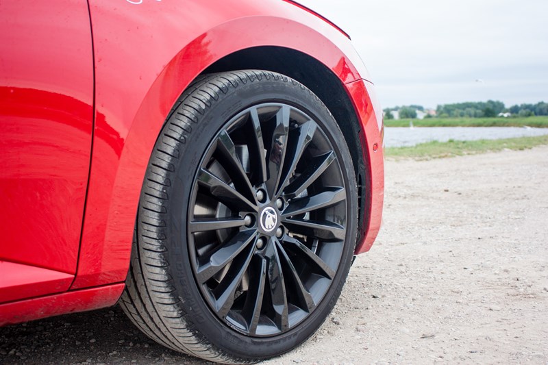 Skoda Superb w kolorze czerwień Corrida i 19-calowymi czarnymi, polerowanymi obręczami ze stopów lekkich uwydatniała wszystkie zalety modelu. W dynamiczną i agresywną sylwetkę wkomponowano elementy nadające jej eleganckiego charakteru. Zaokrąglenia zostały zastąpione wyrazistymi liniami i przetłoczeniami, dzięki czemu Superb wprost emanuje agresją i siłą.