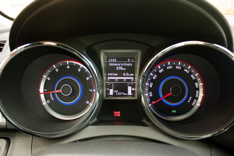Zegary umieszczone na desce rozdzielczej wyglądają nowocześnie i przejrzyście, a ponadto kierowca ma możliwość dostosowania kolorystyki podświetlenia pod swoje osobiste preferencje. Ciekawy gadżet, chociaż nie do końca rozumiem, dlaczego dostępny jest jedynie w najwyższej wersji wyposażenia. Kolejną ciekawostką jest ekran komputera pokładowego znajdujący się pomiędzy obrotomierzem a prędkościomierzem, którego wizualizacje i ilość wyświetlanych informacji uzależniona jest od poziomu wyposażenia. Przyczepić można się również do samych przycisków umożliwiających obsługę komputera pokładowego, które zostały umieszczone na środkowym tunelu. Dużo lepszym rozwiązaniem byłoby umieszczenie przycisków na sportowo wyglądającej kierownicy.