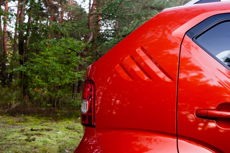 Przód wygląda tak jakby się do nas uśmiechał. W szeroką atrapę chłodnicy wmontowano przednie reflektory, które wyglądają niecodziennie i zawierają w sobie światła do jazdy dziennej w kształcie litery „U”. Troszeczkę „terenowego” charakteru dodają napompowane nadkola i plastikowe osłony znakomicie kontrastujące z lakierem nadwozia. Całość uzupełniały relingi dachowe i czarne felgi, które prezentują się bardzo fajnie, ale właściwie uniemożliwiają jazdę poza utwardzonymi drogami. Szkoda byłoby je porysować.