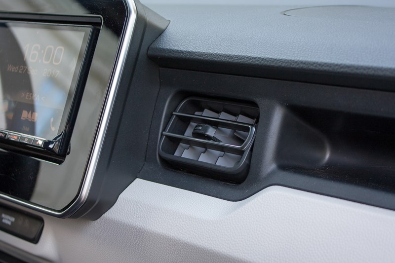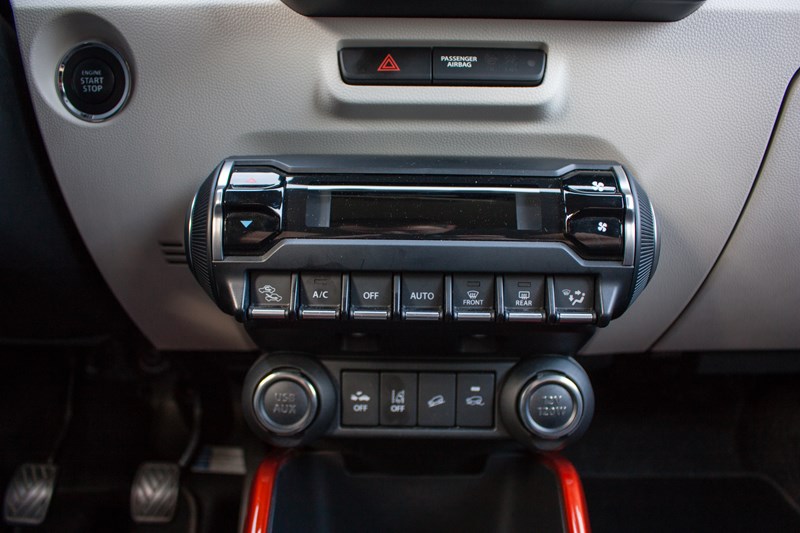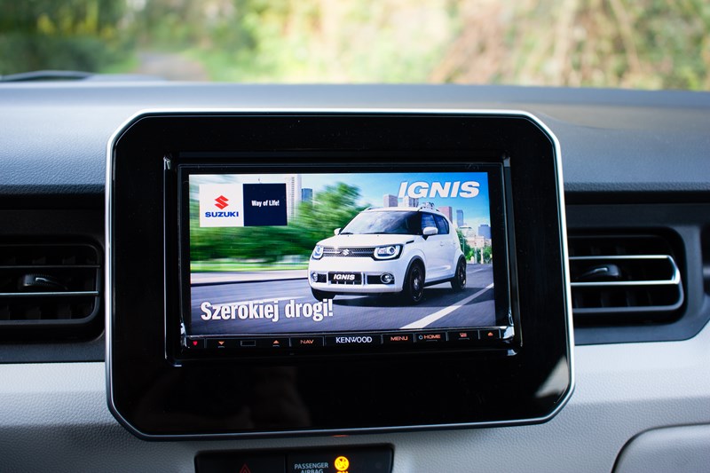 W centralnym punkcie umieszczono wystający ekran nieseryjnego systemu multimedialnego Kenwood, którego obsługa nie jest zbyt skomplikowana, ale działa z wyraźnym opóźnieniem i przy większym nasłonecznieniu jest nieczytelny. System audio jest po prostu kiepski. W podstawowej wersji wyposażenia przymknęlibyśmy na to oko, ale nie w najwyższej. Nie rozumiemy dlaczego Suzuki nie potrafi zamontować czegoś lepszego. Poniżej umieszczono świetnie zaprojektowany panel klimatyzacji. Ma niecodzienny kształt i przyciski kojarzące się z lotnictwem.