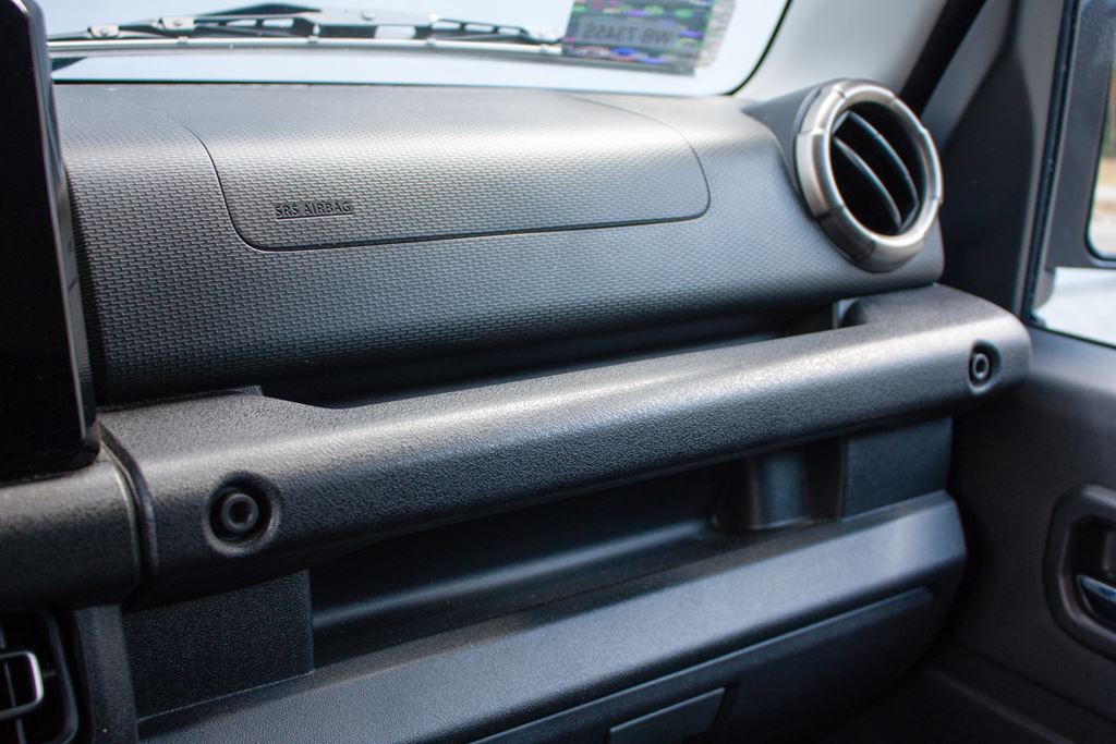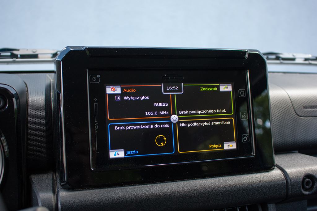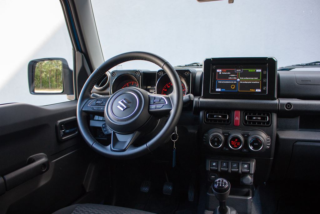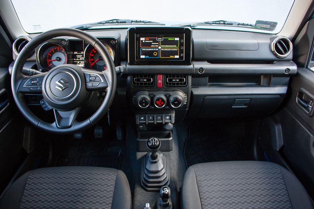 Kabina pasażerska jest dokładnie taka sama jak sylwetka Suzuki Jimny. Wszystko jest proste, funkcjonalne i nawiązuje trochę do czasów minionych. Daleko mu do modnych obecnie crossoverów i SUV-ów, ale tego właśnie można było się spodziewać po rasowej terenówce. Pudełkowate nadwozie sprawiło, że projektanci mogli w maksymalnym stopniu wykorzystać kompaktowe wymiary samochodu, dzięki czemu czteroosobowe wnętrze jest zaskakująco przestronne. Już na wstępie trzeba powiedzieć też o tym, że ergonomia w terenówce ma niewiele wspólnego z ergonomią w miejskim samochodzie. Tutaj za funkcjonalne i praktyczne uznajemy wszystko to co ułatwia jazdę na bezdrożach.
