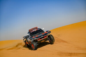 Rajd Dakar 2023 zaskoczył uczestników wysokim stopniem trudności i zawirowaniami w klasyfikacji. Kamieniste odcinki, na których po prologu rywalizowali zawodnicy, doprowadziły do sytuacji, że wszystkie trzy Audi RS Q e-tron Team Audi Sport kolejno przebijały opony. W sumie takich „gum” cały Team naliczył aż czternaście. Odcinki z „wielbłądzią trawą” na piątym etapie powodowały z kolei wzmożone ciśnienie w amortyzatorach, a tym samym duże obciążenia zarówno dla samochodów, jak i dla załóg. I wreszcie deszcz: nie tylko spowodował nieoczekiwane utwardzenie piasku, ale wymusił też zmianę trasy. Ze względu na zalanie biwaku, przed dniem odpoczynku 9 stycznia, organizatorzy wprowadzili etap „półmaratonu” ze zmodyfikowaną trasą i ograniczonym serwisem.